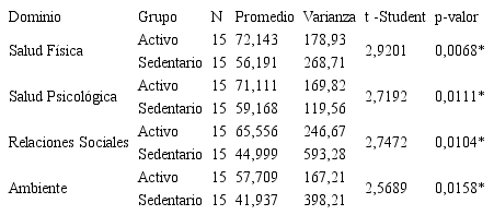 En las figuras 2, 3, 4 y 5 y la Tabla 3, se observa la distribución de los puntajes obtenidos de la percepción para cada dominio (salud física, salud psicológica, relaciones sociales y ambientales). Los resultados indican diferencias significativas para la salud física, con valores de P<0,0068, salud psicológica P<0,0111, relaciones sociales con un valor de P<0,0104 y ambiente P<0,0158, es decir, que el promedio de la percepción para los dominios de salud física, salud psicológica, relaciones sociales y ambiente, son significativamente distintos en el grupo de mujeres con actividad física y en rehabilitación física.