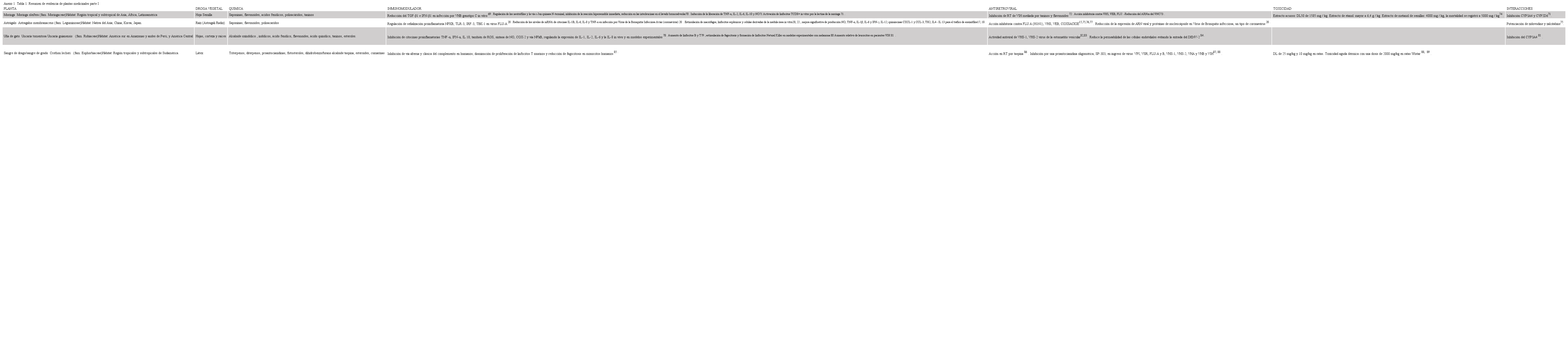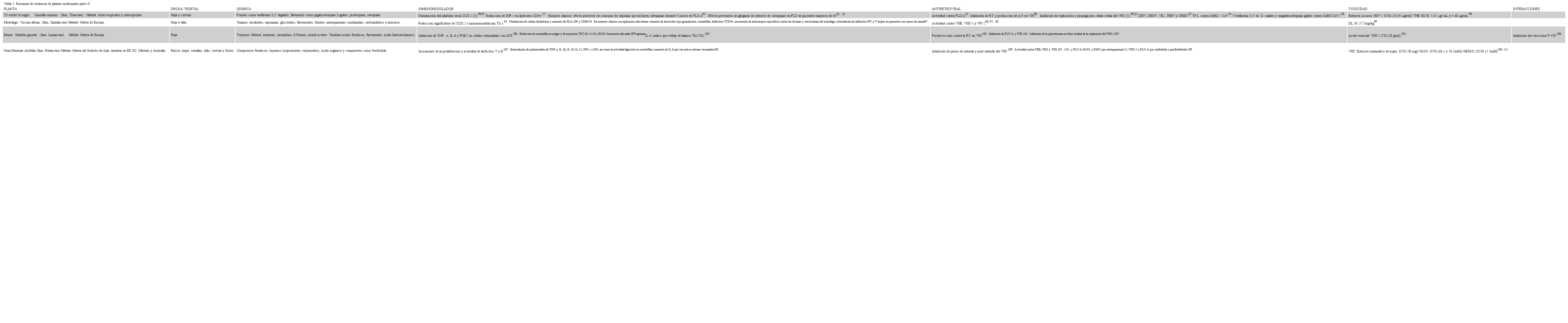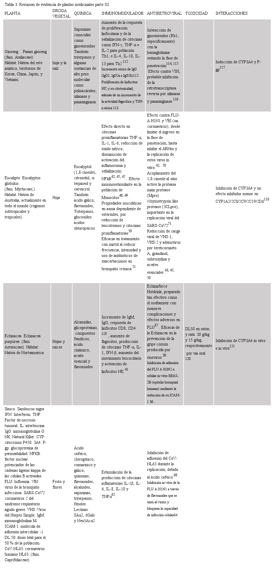 A continuación, se resumen las plantas que presentan estudios con acción anti-coronavirus:Aloevera, Astragalo membranaceus, Camellia sinensis, Echinacea purpurea, Eucalyptus globulus, Glycyrrhiza glabra y Sambucus nigra. Las otras siete plantas medicinales que no mostraron evidencia contra este virus se describen en el Anexo N°1, junto a las plantas que se exponen en los siguientes párrafos. No se entiende por qué agregaron estas plantas al trabajo actual It is not understood why these plants were added to the current paper.
