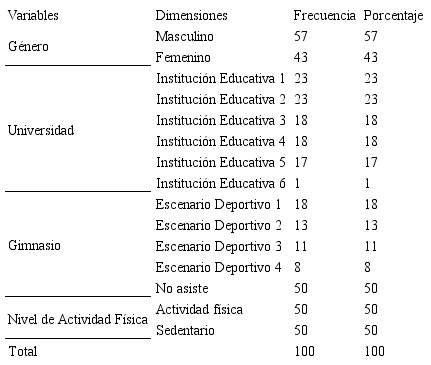 Las características de la muestra (Tabla 1) indican que el 57% (n=57) pertenecen al Género Masculino y el 43% (n=43) al Género Femenino. En lo relacionado a la Variable Universidad el 23% (n=23) pertenecen a la Institución Educativa 1, el 23% (n=23) a la Institución Educativa 2, el 18% (n=18) a la Institución Educativa 3, el 18% (n=18) a la Institución Educativa 4, el 17% (n=17) a la Institución Educativa 5 y el 1% (n=1) a la Institución Educativa 6. En la Variable Gimnasio se identificó que el 18% (n=18) asiste al Escenario Deportivo 1, el 13% (n=13) al Escenario Deportivo 2, el 11% (n=11) al Escenario Deportivo 3, el 8% (n=8) al Escenario Deportivo 4 y el 50% (n=50) de la muestra no asiste a ningún Escenario Deportivo. Finalmente, en lo correspondiente a la Variable Actividad Física, se encontró que el 50% (n=50) obtuvo un nivel alto y el 50% (n=50) obtuvo un nivel bajo.
