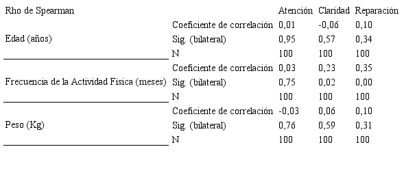 Para determinar la relación entre las variables independientes (Edad, Frecuencia de la Actividad Física y Peso) y las variables dependientes (Atención Emocional, Claridad Emocional y Reparación Emocional) se utilizó el coeficiente de correlación de Spearman, debido a que esta prueba permite obtener un coeficiente de asociación entre variables que no presentan una distribución normal. Este coeficiente se calcula con base en una serie de rangos asignados, y los valores oscilan de -1 a 1, siendo 0 el valor que indica no correlación, y los signos indican correlación directa e inversa32. Nuestros resultados indican que existe evidencia estadísticamente significativa para rechazar la hipótesis nula que indica la independencia entre las variables (p<0,05) (Tabla 2). Al analizar la Tabla 2 se determina que existe relación estadísticamente significativa entre la Frecuencia de la Actividad Física y la Claridad Emocional (p<0,02), y entre la Frecuencia de la Actividad Física y la Reparación Emocional (p<0,001). También se evidencia una relación positiva indicando que, a mayor Frecuencia de la Actividad Física, mayor será la Claridad Emocional (Rho: 0,23) y la Reparación Emocional (Rho: 0,35).