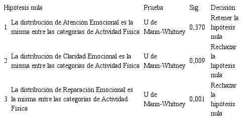 Al analizar los resultados de la Prueba U de Mann-Whitney, se puede afirmar que no existen diferencias estadísticamente significativas en la distribución de la Atención Emocional según la Actividad Física (p<0,370), sin embargo, en las distribuciones de Claridad Emocional (p<0,009) y Reparación Emocional (p<0,000) si se presentan estas diferencias (Tabla 3), evidenciando que la Actividad Física favorece al desarrollo de la Inteligencia Emocional en esas dimensiones (Figura 1, 2 y 3).