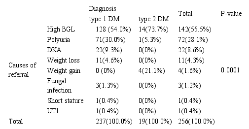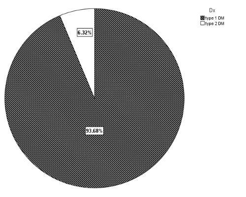 This research aims to find the frequency of T2DM among children and adolescents presented first with diabetes. From 253 children who had been newly diagnosed with diabetes during the study period; the majority of them had type 1 DM while only 16 patients presented type 2 DM. This gives a proportion rate of 6.3% (Figure 1).