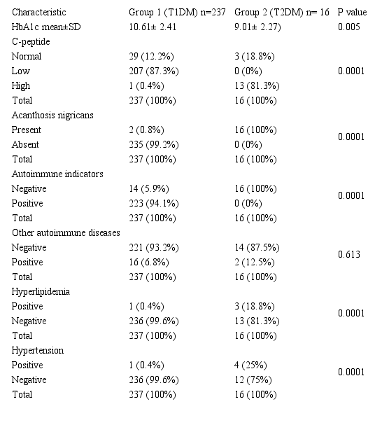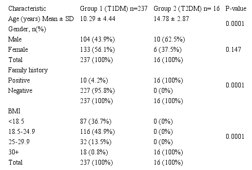 The mean age of patients in group 2 (presented with type 2 diabetes) was 14.78 ± 2.87 years, which was significantly different from the 1st group patients (presented with type1 diabetes) with P=0.0001. All of the patients in group 2 had a positive family history of type 2 diabetes, and a high body mass index, both parameters were significantly different from the type 1DM group (P=0.0001). No statistically significant difference between genders in the two groups as presented in Table 1.
