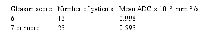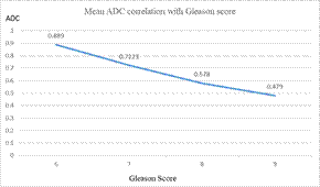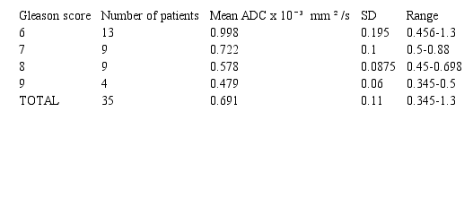 The mean ADC values of different Gleason scores of tumors are given in Table 1.
