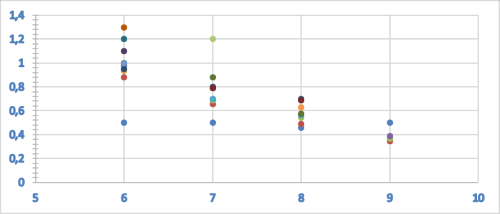 GS of (6) in 13 patients, ADC value was (0.99± 0.19) x 10̄³ mm²/s). In 9 patients with GS 7, the (mean ± SD) ADC value was (0.7 ± 0.1) x 10̄³ mm²/s). GS of (8) in 9 patients, ADC value was (0.58 ± 0.088) x 10̄³ mm²/s), GS of (9) in 4 patients, ADC value was (0.48 ± 0.06) x 10̄³ mm²/s). There was a negative significant association between ADC values in PZ cancer and tumor Gleason score (Figure 3).
