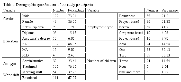 Considering the drop likelihood, 190 questionnaires were distributed in a cluster-based random manner in proportion to the population of the headquarter and healthcare-treatment personnel, and 165 questionnaires were collected with 39 of them being completed by the administrative staff and 126 of them being completed by the treatment personnel.