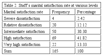 The average age of the study participants was 36.43 (with a standard deviation of 8.7). Moreover, the average service period was 13.42 years (with a standard deviation of 9.08) and the average marriage term was 12.27 years (with a standard deviation of 8.70). The mean marital satisfaction of the study participants was found equal to 160.94 (with a standard deviation of 33.80) which are in a range from 72 to 223. Table 2 shows the marital satisfaction of the employees at various levels.