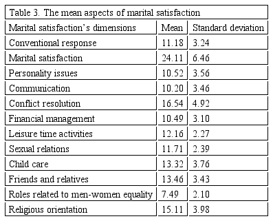 As it is shown in the results of Table 3, the highest marital satisfaction is in the conflict-resolution dimension and the lowest marital satisfaction is in the dimension related to the men-women parity roles.