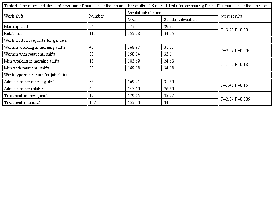 The perception of the factors related to couples’ marital satisfaction can help them improve their relations and elevate the success chances of their marriages16. This issue is of greater importance in couples. Moreover, awareness of the occupational factors related to marital satisfaction can help employers contribute to the improvement of marital satisfaction and enhancement of the workforce’s productivity by considering the vocational factors. Considering the probable effects of job and occupational conditions, including job turns, on the marital satisfaction rate in the individuals and the paradoxical results in this regard, the present study aims to assesses the marital satisfaction status of the personnel working in Jiroft’s Medical Sciences University and its comparison between two groups of the personnel working in the ordinary daytime hours and the personnel working in various job shifts.