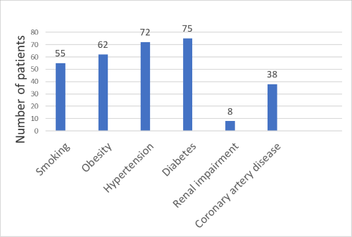 The associated risk factors were nearly similar in both groups with a high prevalence of diabetes, hypertension, smoking and obesity, like the other similar studies4,5,7.