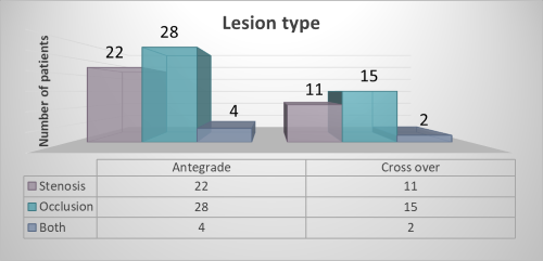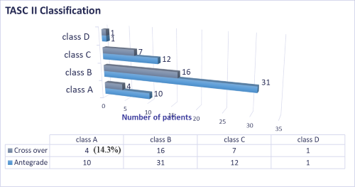 The no. of endovascular techniques for management of peripheral arterial illness remains to increase, as slightly invasive techniques have developed to the initial methodology answer for arterials lesion in lower limbs. While the normal management plan has been to entree the contralateral common femoral artery (CFA), an ipsilateral, antegrade CFA method has definite benefits. The maximum benefits are the reduction in the access-to-lesion region, which in turn recovers the mechanical benefit and receptiveness of the tools used to achieve the interference5. Although there is limited literature comparing the antegrade and cross over femoral access in the endovascular treatment of femoropopliteal lesions, in this study we compare between these two techniques by evaluating the [crossing success, incidence of complications, fluoroscopy time and contrast volume] in each group. In this study more than 75% of the patients were male which indicates that PAD is more common in the male gender, which was comparable with the result obtained by Li Y, Esmail A et al. and Ahmed Eid, SigridNikol6,7, that show PAD more common in male patients. The mean age in this study was 60.9, meaning that PAD more common in old age although our youngest patient was 42 years old, which was comparable with the results of Li Y, Esmail A et al. and Ahmed Eid, SigridNikol6,7. Regarding associated risk factors, the most common were diabetes and hypertension, and to less extent smoking and obesity, same as the result of Li Y, Esmail A et al. and Yonas Akalu, Ambaye Birhan6,8. The preoperative diagnostic assessment revealed occlusive lesions were more common among our patients [43 patients with the occlusive lesion, 33 patients with stenotic lesion] which were comparable with Yukun Li et al. 6 where the occlusive lesions also were more common than stenotic lesions. Forty-five patients from 82 patients presented with stage III and 37 patients with stage IV Fontaine classification, patients with stage I and II excluded from the study because most of them asymptomatic or have intermittent claudication. The use of antegrade access was the preferred access in about 66% of patients in the study as the antegrade approach has the advantage of permitting the use of shorter tools and additional support for manipulating catheters and guide wires [9]. The most common site of lesion was SFA, which associated with greater functional impairment, this lesion counting 67% of all lesions among patients included in the study. When the patients angiographically classified according to TASC II classification, more 50% were class B, there was no significant statistical difference between the two treatment groups, which was comparable to. Vossen et al. study who had about 53% TASC II B class10. Our result disagrees with Li Y, Esmail et al.6 were 88% of patients TASC II class D, and Caitlin W. Hicks et al. 11.