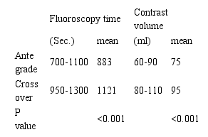 Fluoroscopy time (mean 1121 sec) in the cross over femoral cross over technique was significantly higher compared to the antegrade femoral technique (mean 883 sec), P < 0.001. The contrast volume (mean 95 ml) used in the cross over femoral cross over technique was significantly higher compared to the antegrade femoral approach (mean 75 mL), P <0.001.