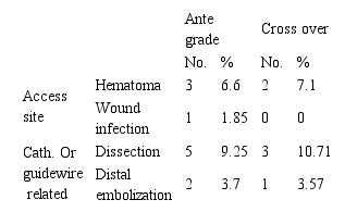 Catheter or guide wire related complication (9.25%) in the antegrade group developed dissection, while in cross over the group (10.71%) developed dissection, flow-limiting dissection treated by stent implantation which was comparable to dissection mentioned by Rianne J. Vossen et al. who had 15% of dissection which also treated by stent implantation [10]. There was no arterial perforation in either group, which was also insignificant 0.4% in Li Y, Esmail et al. 6.
