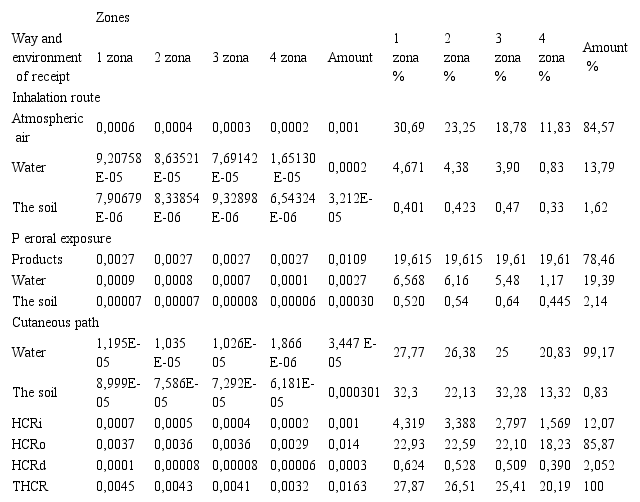 The obtained results allowed to reveal the highest and the lowest contributions of the exposure media and routes of the chemicals’ entry, identify the priority contaminants and the routes of their entry into the adolescent bodies, identify the zones, where the adolescents were most often exposed to carcinogenic risk, and also determine the total carcinogenic risk for each route of carcinogen entry and the total carcinogenic risk for all routes in adolescents in all four zones, which made 0.02681 corresponding to the high risk level (10-1 - 10-3) (Table 2).