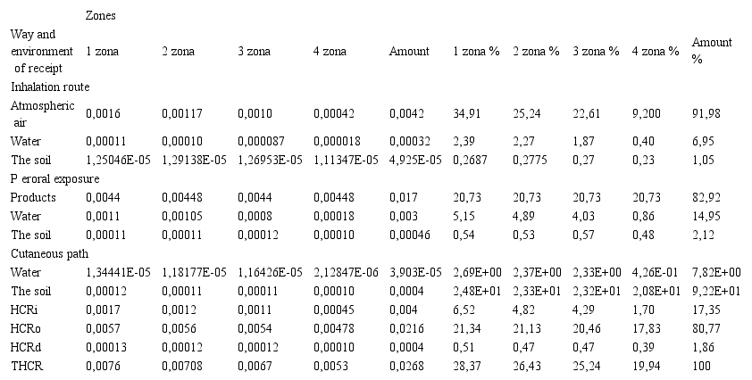 The total carcinogenic risk with the account of peroral exposure (foods, drinking water and soil) ranged from 2.98Е-03 (the 4th zone) to 3.74Е-03 (the 1st zone). The contribution of the media under study to the peroral route of the chemicals’ entry was distributed in the following way: foods ranked first (78.46%), the drinking water ranked second (19.39%), and soil ranked third (2.14%). Thus, it can be said that the major contribution to peroral route of the chemicals’ entry is made by foods (78.46%), and the lowest one – by soil (2.14%), mainly as a result of arsenic intake in all zones, in the 2nd and the 3rd zones (6.44Е-05 and 8.38Е-05 correspondingly) in particular.