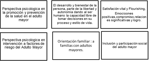 La producción científica advierte la existencia de acciones de intervención primarias y secundarias dirigidas a la búsqueda del bienestar y calidad de vida del adulto mayor (Calatayud, Plo y Muro56). Sin embargo, aún es fundamental, medir el real impacto de dichas acciones desde las perspectivas psicológica y social, en especial las que se desarrollan a partir de las políticas sociales para la atención al adulto mayor. De igual forma, se enfatiza la importancia de las relaciones interpersonales significativas y la participación social de la tercera edad, siendo necesaria la orientación familiar y comunitaria (Escuder, Liesegang y Rivoir57; Ruch, Proyer y Weber58).