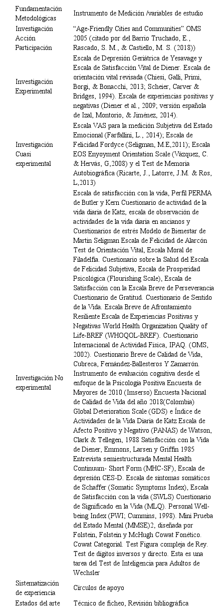 La producción científica revisada corresponde a investigaciones no experimentales de alcance descriptivo, apoyada de Instrumentos de medición de variables de estudio como la Escala de satisfacción con la vida, Escala de Afecto Positivo y Negativo (PANAS) de Watson, Clark y Tellegen (citado por García44), Escala de Felicidad de Alarcón; para describir el estado de las variables en sujetos en comunidades de adultos mayores, institucionalizados o no institucionalizados. A continuación, en la Tabla 2. se describen los instrumentos más utilizados para el desarrollo de investigaciones con adultos mayores, se espera que el consolidado de estos instrumentos sea de utilidad para la replicabilidad o formulación de estudios posteriores con población adulta mayor.