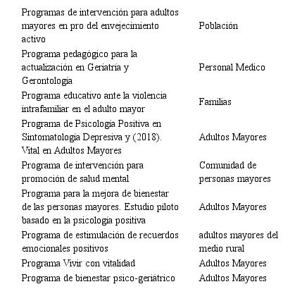 Otra proporción (Peixoto45) de las investigaciones fueron cuasi experimentos y experimentos con pre test y post test, para evaluar el impacto de las acciones de intervención, resaltando las acciones con terapias alternativas y fundamentos de la psicología positiva (Guadalupe46; Izal, Bernabeu, Martínez, Bellot y Montorio47) con efectos positivos en la población adulta, un ejemplo de ello, es el Programa de aprendizaje para la Tercera Edad (Bernad48) compuesto por actividades de desarrollo personal para los adultos mayores (p. 112). Entre otras intervenciones, se encuentra el mindfullness, aplicado a diversas situaciones vitales, en favor de la adaptación, autorregulación y felicidad (Segovia49). Y solo unos pocos de los 70 artículos revisados corresponden a programas de intervención, revisiones y reflexiones teóricas. Entre los programas de intervención para adultos mayores en pro del envejecimiento activo se identificaron los dirigidos a comunidades de adulto mayor, personal médico, familias y atención individualizada y particular, los cuales, se enlistan en la Tabla 3 (Rodríguez50).