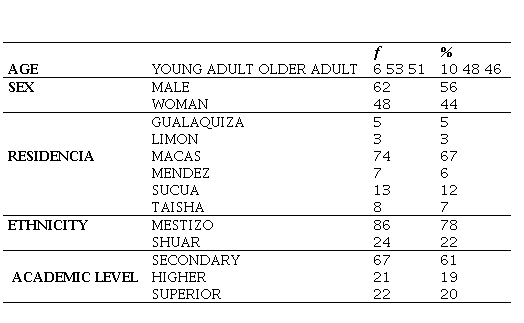 According to age, most of the infected persons were adults and older adults, according to sex, COVID-19 prevailed more men than women residing in the city of Macas and Taisha. The majority of this group had primary education followed by professionals with third level education.