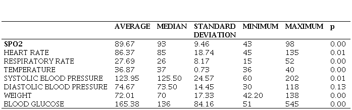 Regarding the vital signs on admission to the service, most patients were afebrile with mean temperatures of 36.8°C, tachypneic, saturating over 90% with oxygen support. Blood pressure between 125/ 75 mmHg and with metabolic disorders given the values of capillary glycemia with maximum values of 545 mg/dl and minimum of 51 mg/dl at admission. The maximum weight recorded was 138 kg and the minimum weight was 42.20 kg.