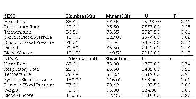 It can be seen that there are differences in the clinical characteristics according to the demographic data. According to age there are differences at respiratory level. The group of adolescents and young adults presented moderate to severe hypoxia, while, the group of adults and older adults presented mild hypoxia. It should be noted that all saturation values were taken with supplemental oxygen support. Regarding respiratory frequency, all age groups, sex and ethnicity presented some degree of tachypnea. However, the group of adults and older adults presented higher tachypnea. The highest mean weight recorded was in the group of adolescents, young adults and older adults. It was found that the mestizo ethnic group registered higher weights than the Shuar ethnic group. Capillary glycemia is elevated in women of mestizo ethnicity and in all age groups, but the group of adolescents and older adults is noteworthy because it shows a higher peak of capillary hyperglycemia.