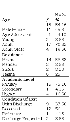 The most frequent residence of 67% of the patients was the city of Macas, and Sucua with 12%, while the rest of the patients said they belonged to other cantons of the province. The highest number of infections according to ethnicity was: mestizo with 78% of those admitted, while in the Shuar ethnicity it was 22%. The percentages according to academic level were primary school with 61%, high school with 20%, followed by secondary school with 19%.