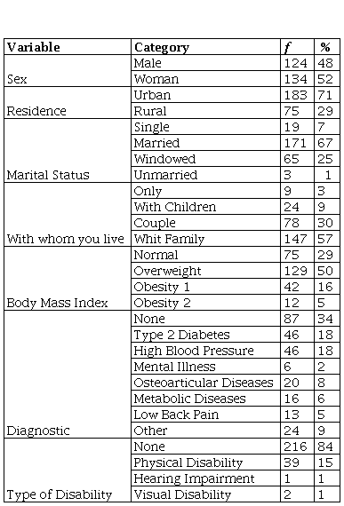 From the review of the clinical history of 258 older adults, the following information was obtained 134 (52%) female sex, 183 (71%) urban residence, 171 (67%) married marital status, 147 (57%) living with a family.