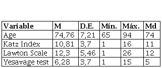 The mean age of the population was 74.76, the Katz Index 10.81, the Lawton and Brody Scale was 12.3 and the Yesavage Test was 6.28.