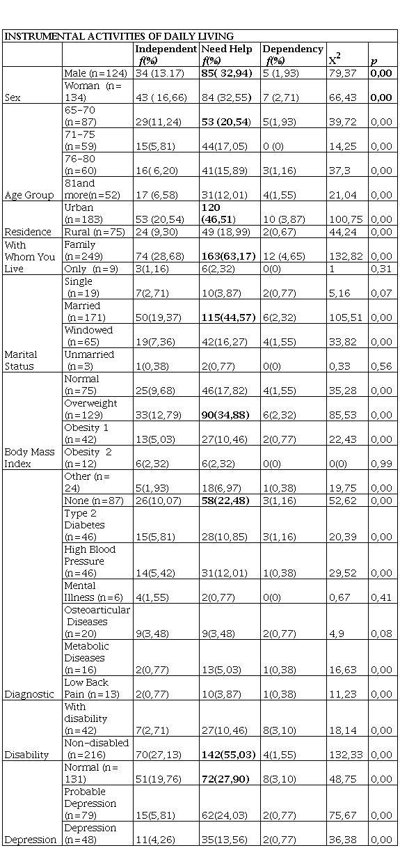 There is evidence of statistically significant relationships according to the x2 the instrumental activity of daily living in need of some help and the variables sex: male (x2= 79.37; .= .00; n=124), female (x2= 66.43; .= .00; n= 134). 00; n= 134) i.e. there is a higher percentage in female sex with 32.94%, age group 65-70 years (x2=39.72; .= .00; n=87), 71-75 years (x2=14.25; .= .00; n=59), 76-80 years (x2=37.3; .= .00; n=60), 81 and more years (x2=21.04; .=. 00; n=52), highlighting the age group 65-70 years with 20.54%, urban residence (x2=100.75; .= .00; n=183), rural residence (x2=44.24; p=.00; n=75) with prevalence in the urban sector with 46.59%, in relation to cohabitation with family (x2=132.82; .=. 00; n=249) with 63.17%, marital status married (x2=105.51; .=.00; n=171), widowed (x2=33.82; .=.00; n=65) with a predominance of married with 44.57%, normal body mass index (x2=35.28; .=. 00; n=75), Overweight (x2=85.53; .= .00; n=129), Obesity 1 (x2=22.43; .= .00; n=42) with overweight standing out with 34.88%, in the variable Diagnoses: other (sutures, surgical control) (x2=19.75; .=. 00; n=24), without morbidity (x2=52.62; .= .00; n=87), Diabetes Mellitus 2 (x2=20.39; .= .00; n=46), Arterial Hypertension (x2=29.52; .= .00; n=46), Metabolic Diseases (x2=16.63; .= .00; n=16), lumbago (x2=11.23; .=. 00; n=13) with an incidence of no morbidity with 22.48%, with reference to disability (x2=18.14; .= .00; n=42), no disability (x2=132.33; .= .00; n=216) with most of no disability with 55.03%, and with reference to no Depression (x2=48.75; .=. 00; n=131), with Probable Depression (x2=75.67; .= .00; n=79), with Depression (x2=36.38; .= .00; n=48) showing that the normal state stands out with 27.90%.