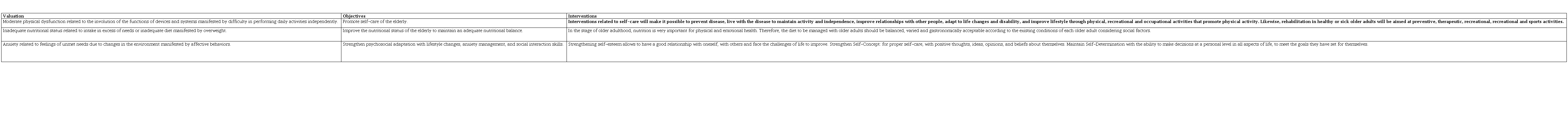 Through the application of the interventions, all the skills in the physical function of the elderly will be optimized to improve their nutritional status and define their social role so that they remain active and healthy, improving the primary health of the group studied.