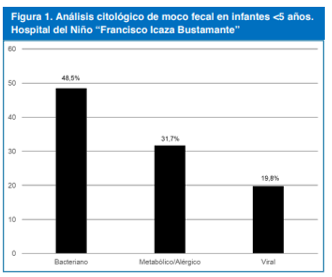 En condiciones normales, las heces no suelen contener células epiteliales, ni leucocitos, ni eritrocito y el moco fecal se compone por residuos alimentarios y fluidos provenientes del epitelio intestinal (intestino delgado y grueso), los cuales aumentan en el curso de procesos inflamatorios de origen infeccioso. Este análisis retrospectivo muestra el análisis citológico del moco fecal en infantes menores de 5 años del Hospital del Niño “Francisco Icaza Bustamante”, Ecuador; una potencial estrategia que facilitaría el manejo terapéutico de este frecuente síndrome clínico.