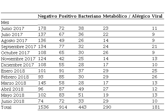 En total se analizaron 2450 muestras de moco fecal, de las cuales 914 fueron positivas con predominio de hallazgos citológicos bacterianos (48,5%; n=443), seguido de metabólicos / alérgicos (31,7%; n=290) y virales (19,8%; n=181) Figura 1. En la Tabla 1 se muestra la distribución según los meses de evaluación.