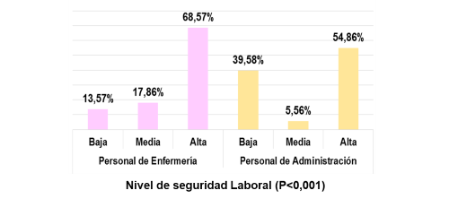 El personal de enfermería mostró una percepción de alta seguridad laboral (68,57%) en todas las actividades que desempeñan, al igual que el personal de administración (54,86%), pero en menor proporción (Figura 1). En el personal administrativo existe un porcentaje elevado de personas que considera su seguridad laboral como baja (39,58%), mientras que esta proporción es muy baja el personal de enfermería.