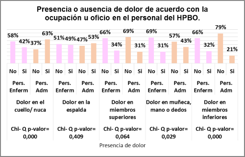 La Figura 2 muestra que el personal de administración tiene una mayor frecuencia de dolor en cuello/nuca (63,2%), espalda (53,5%) y muñeca, manos o dedos (43,1%). Mientras que en el personal de enfermería el dolor fue más frecuente en los miembros inferiores (32,1%) y la espalda (48,6%) (p<0,05).