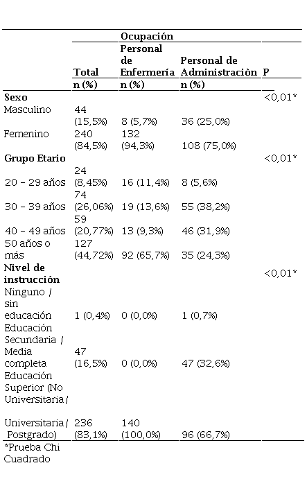 Las características sociodemográficas se muestran en la Tabla 1, el mayor porcentaje del personal que labora es del sexo femenino (84,5%; n=240). En cuanto a la edad, más de 50% de los que laboran en el área de enfermería tienen 50 años y más, mientras los administrativos se encuentran entre 30 y 39 años (38,2%; n=55). El nivel de instrucción de los que laboran es alto con formación en educación superior (83,1%; n=236). Las variables sexo, edad y nivel de instrucción mostraron asociación con la ocupación (p<0,01) (Tabla 1).