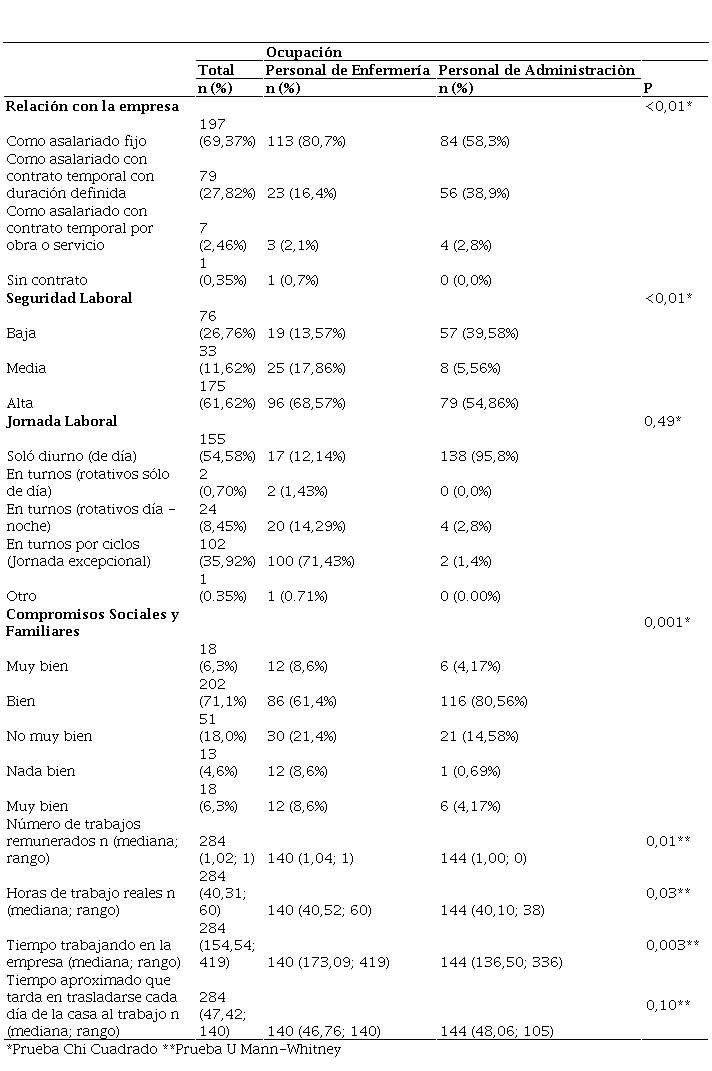 El personal de administración no realiza ninguna otra actividad económica que le genere ganancias adicionales. El promedio de horas de trabajo semanales del personal es de aproximadamente 40 horas/semanal y el personal de enfermería presenta el mayor tiempo promedio laborando en la institución, con un valor de aproximadamente 14 años. La mayoría del personal labora en el turno diurno (54,6%; n=155)), seguido por aquellos laboran en turnos por ciclos (35,9%; n=102), principalmente el personal de enfermería (71,4%; n=100). Asimismo, el número de trabajos remunerados, horas de trabajo, tiempo en la empresa, relación con la empresa, seguridad laboral y compromisos familiares estaban asociados estadísticamente con la ocupación del personal (p<0,05) (Tabla 2).