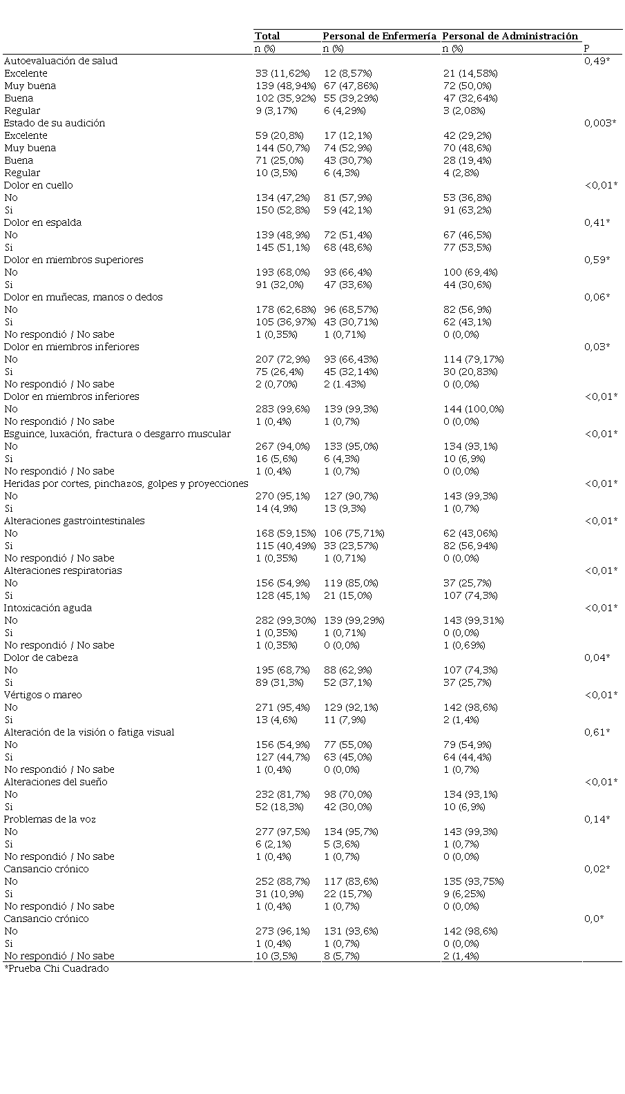 En la institución, mayoritariamente el personal considera su salud como excelente y muy buena (60,5%), mientras que una menor proporción considera que esta es regular (3,2%). Además, en su mayoría el personal en las últimas 4 semanas ha presentado en alto porcentaje de dolores en cuello/nuca, espalda, miembros inferiores, alteraciones gastrointestinales, entre otros; especialmente el personal de enfermería (Tabla 3).