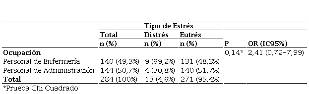 La presencia de distrés fue mayor en el personal de enfermería (69,2%; n=9) en comparación con el personal administrativo (30,8%; n=4) (Tabla 4).
