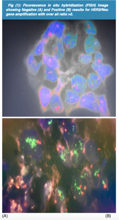 “HER2 is a proto-oncogene” establish on “chromosome 17q” coding tyrosine kinase receptor situated on the external membrane of the breast epithelial cells. “HER2” acts on epidermal growing element to regulator numerous cellular tasks, like propagation and differentiation of cell, cell persistence, “apoptosis, angiogenesis, migration, and metastasis”, “Her-2/neu gene amplification” happens in (20 to 30%) of breast Ca.1,2, it associate with quick tumor development, increased danger of reappearance after operation, deprived reaction to conservative chemotherapy and poorer prognosis with decreased general survival rate3,4. Testing of Her-2/neu status is important subsequently the support of “trastuzumab” for the management of Ca. breast with Her-2 positive, “trastuzumab” link to the extracellular area of “Her-2/neu” and prevent propagation of malignant cells that over express Her-2/neu also encourages antibody apposite to malignant cells.“Lapatinib, Her-1/Her-2” double receptor preventer introduced for treatment patients with stating gene amplification. Inappropriately, the management is costly and transports severe opposing effects like cardiotoxicity as well as Herceptin. Together drugs being effected only in cancers with gene magnification1,6. Correct valuation of Her-2/neu status in specific malignant cells is obligatory before presentation of particular treatment plans and has thus occupied on excessive in usual work up of Carcinoma of breast [7–8]. The two utmost broadly used skills for evaluation of “Her-2/neu are IHC and FISH”, together apply on formalin fixed paraffin entrenched tissues. “FISH” have good sensitivity besides specificity in identifying “Her- 2” magnification but needs special equipment and knowledge to achieve and understand the consequences1,9. “IHC for Her-2/neu protein” is broadly used but untrue positive and untrue negative consequences are current. Relative studies state that great association between IHC investigation and FISH in patients with “IHC scores 0, 1+ and 3+”. Disagreeing outcomes are significant in quantity of patients with vague 2+ immunostaining7,10,11. The aim of study is showed the frequency of “Her-2/neu gene” extension in breast cancer identified as “score 2+ by IHC” and to associate with (age, ER status and the pathological grade and stage).