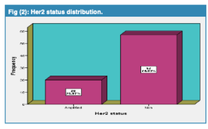 According to fig 1; Her2 status consist of two types in current study, (25.97%) of patients with amplified Her2 status while (74%) of patients with no amplified Her2 status.