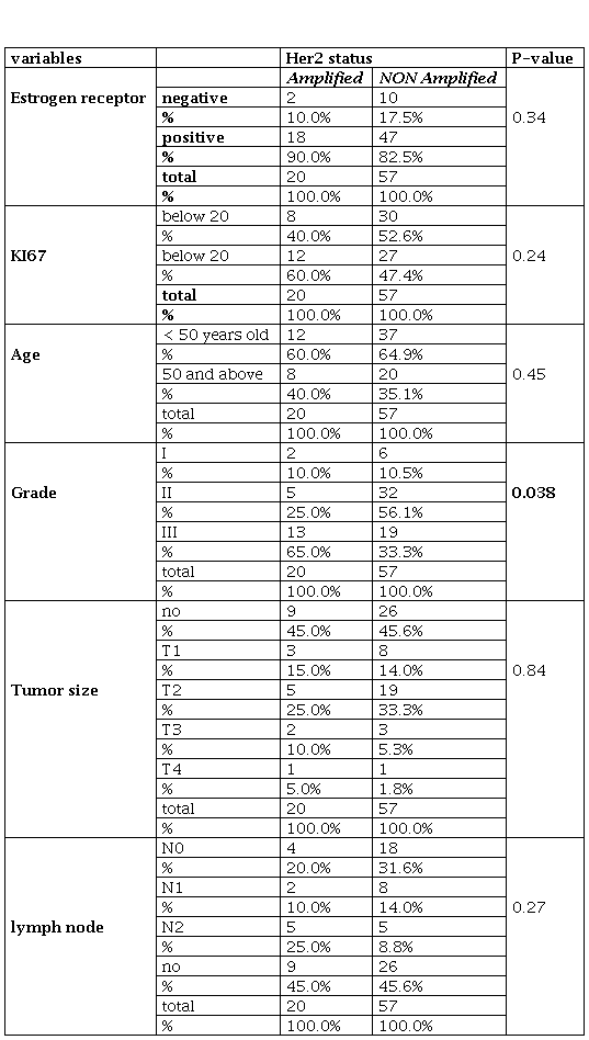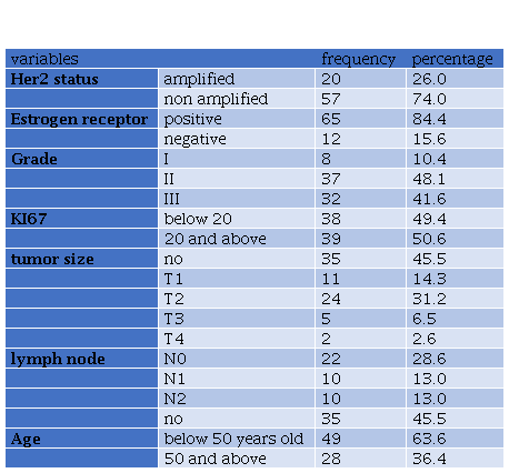 Cross sectional study of 77 patients with mean age (49 ± 11) years old, (26%) of patients with amplified Her2 status, (84%) of patients with positive estrogen receptor, (48%) of patients with grade II and (41.6%) with grade III, (50.6%) of patients with high KI 67 (more than 20), (31.2%) of patients with T2 tumor size, (13%) of patients with N1, N2 lymph node include, finally (63.3%) of patients are below age 50 years. As show in table 1.