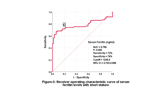 Results: The mean age of the studied subjects were 12.6±3.5 years (range 3–19 years). The mean serum ferritin levels were 1812 ±1024.9 ng/mL, which showed a significant correlation with height, weight, and age. The mean height Z-score was -2.1±1.1, and 70% of the patients had growth failure (GF). The mean weight Z-score was -2.0 ±1.3. Both height and weight had a significant correlation with ferritin levels in BTM patients. ROC-curves revealed a sensitivity, specificity, and CI% of [72%,78% & (0.703-0.858)], respectively for predictability of serum ferritin for GF in BTM patients.