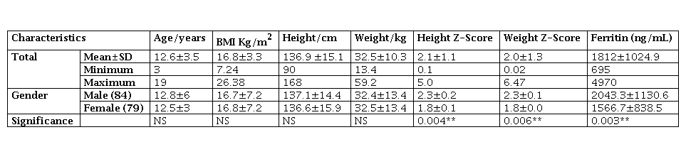 This study comprised 163 BTM patients, 79 (48.5%) females and 84 (51.5%) males. The mean age was 12.6±3.5 years (3-19 range). The median age of the initial blood transfusion was 13 months (10-19 range), and the duration range of regular RBCs transfusion was 11–174 months (results not shown). The mean sera ferritin concentrations were 1812±1024.9 ng/ml (675-4970 range). There were significant variations in the height, weight, and sera ferritin concentrations between the genders, being worse in males (p=0.004, p=0.006, p-0.003), respectively. Two third of all studied patients suffered GF either in mild or severe form.