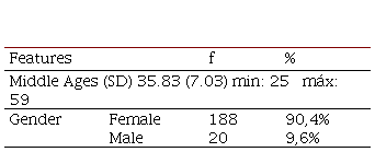 The sociodemographic data (Table 1) show that 90.4% of the sample was female with a mean age of 35.8 years (SD: 7.03), with a minimum age of 25 years and a maximum age of 59 years.