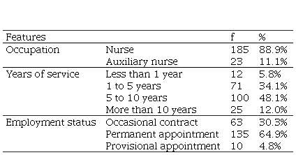 Regarding work characteristics (Table 2), 88.2% were nurses, 82.2% had less than 10 years of work experience. A total of 64.9% have a permanent appointment.