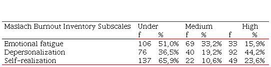 The rating of the statements is as follows: Emotional exhaustion: 1, 2, 3, 6, 8, 13, 14, 16, 20. Depersonalization: 5, 10, 11, 15, 22. Personal fulfillment: 4, 7, 9, 12, 17, 18, 19, 21. The scale is measured according to the following ranges: