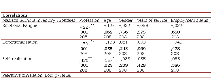 The Pearson's R correlation test was performed between the sociodemographic variables and the three subscales of the Maslach Burnout Inventory, the results obtained are presented in Table 4. It can be seen that the professional variable is the one that presents a significant correlation with emotional exhaustion, depersonalization, and personal fulfillment. However, it is only with the latter that it presents a moderate relationship, as Pearson's R is closer to 0.5.