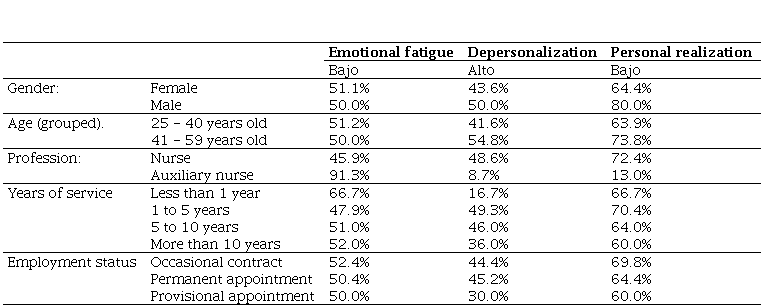 It was determined that the profession presents a significant correlation with emotional exhaustion, depersonalization, and personal fulfillment. Our data point to this possibility since the show that a greater number of nurses compared to nursing assistants present depersonalization and low personal fulfillment. Similarly, few nurses show low emotional exhaustion compared to nursing assistants. It is important to mention that workers with less than 1 year, for the most part, indicate low emotional exhaustion than that those who work more than one year who are more psychologically tired. In addition, it was shown that workers under occasional contracts are the ones who most indicate low personal fulfillment.