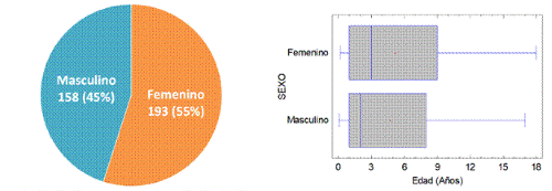 La población estuvo comprendida por 718 pacientes que consultaron por la Urgencia pediátrica, quedando una muestra final de 351 pacientes. La edad promedio fue de 5±5 años; la edad de los niños fue de 4±4 años cumplidos y de 5±5 años para las niñas (p-valor: 0.338). El 52.9 % de los pacientes fueron niñas; siendo la proporción sexual prácticamente de 1:1.