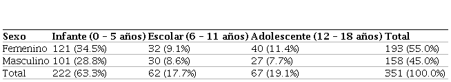 En cuanto a grupo etario, los Infantes (0 – 5 años) representaron el 63.3 % de la población, Escolares (6 – 11 años) el 17.7 % y Adolescentes (12 – 18 años) fue el 19.1 %. Una prueba de independencia de chi² mostró que no había una asociación significativa entre el sexo y el grupo etario (χ²: 0.9077; p: 0.6351) (Tabla 1).